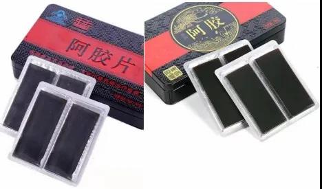 阿胶片为长方形或方形块,黑褐色,有光泽,质硬而脆,断面光亮,碎片对光照视呈棕色半透明气微,味微甘。