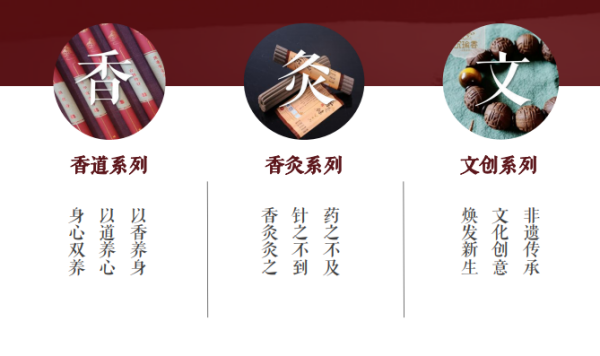 其中香养系列的主要产品有香药灸,香药精油,香药浴液等产品