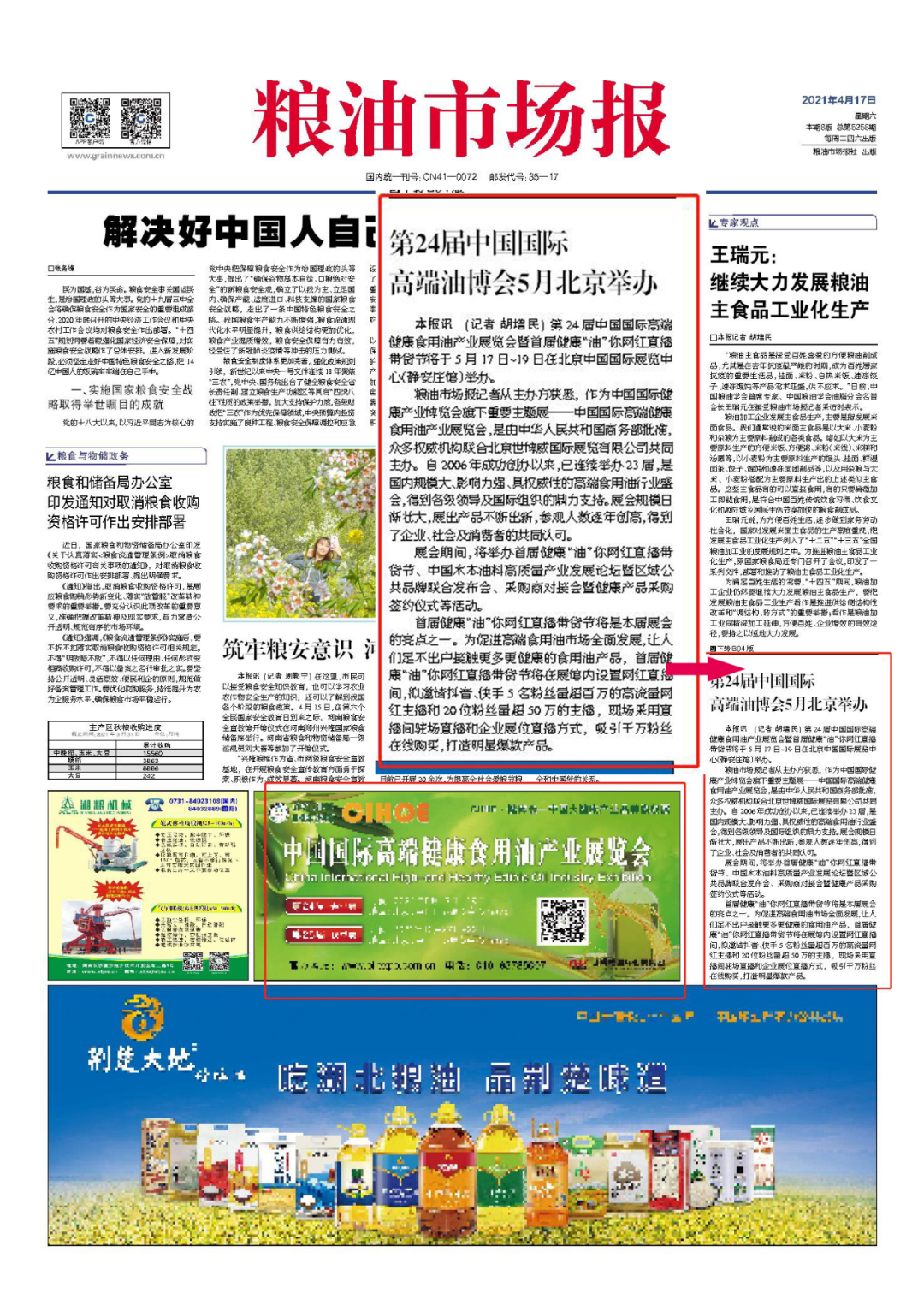 2021年4月17日,粮油市场报在头版以“第24届中国国际高端油博会5月北京举办”为题,对高端油博会的规模、影响力、权威性,及热点活动首届健康“油”你网红直播带货节、中国木本油料高质量产业发展论坛暨健康产品采购签约仪式等进行了报道。