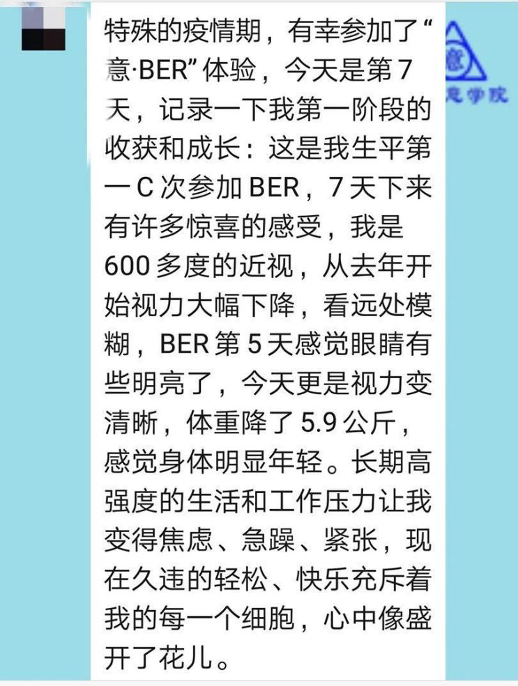 学员6、女48岁,BER21天,正常工作、出差,身心得到全面整合与提升,增加了勇气和自信,对于健康与生活方向,重新思考。一年后,毅然辞职,成为自由职业人。