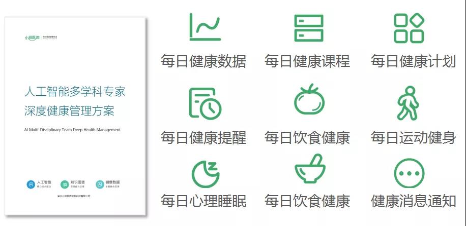 通过人工智能技术深度学习名医专家的健康方案与经验,结合用户的全景健康数据,为用户提供主动的健康行为干预及深度的健康管理方案。指导家人每天的饮食、运动、睡眠、用药、检测等,同时基于长期的健康数据进行深度的智能分析,形成深度的健康管理方案,系统管理家人健康。