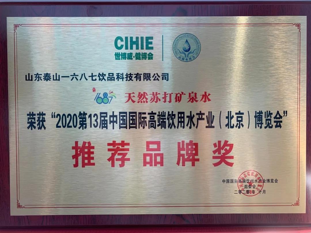 在10月11日-13日举行的2020年第13届中国国际高端饮用水产业(北京)博览会上,泰山1687天然苏打矿泉水斩获“推荐品牌奖”。