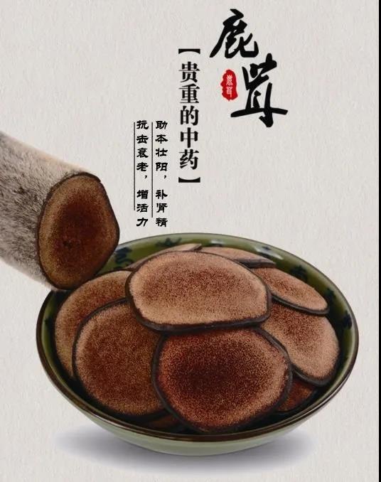 鹿茸为鹿科动物梅花鹿或马鹿的尚未骨化的幼角,性温而不燥,具有壮肾阳,益精血,强筋骨,调冲任,托疮毒的功效,现被列入“保健食品的物品名单”,被《神农本草经》列为上品,被国人奉为极品。鹿茸的成分中主要含有磷脂、糖脂、胶脂、激素、脂肪酸、氨基酸、蛋白质及钙、磷、镁、钠等,其中氨基酸成分占总成分的50%以上。