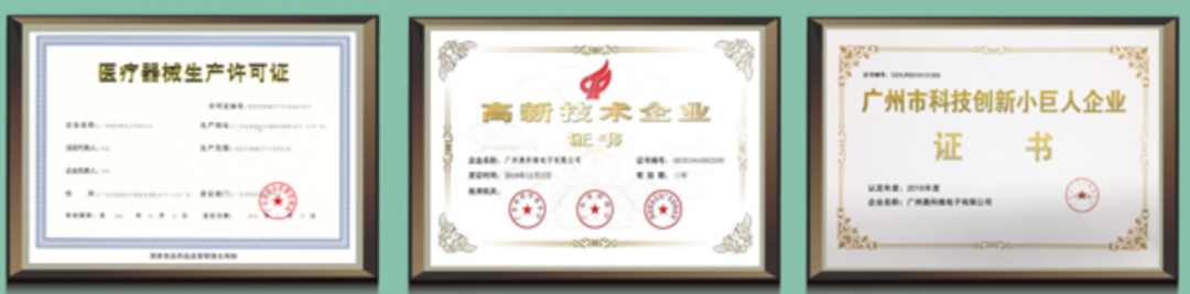 产品通过美国FDA认证、欧盟医疗CE认证、欧盟ROHS环保认证等国际多项认证;体系通过TUV和华光ISO 13485认证、ISO 9001认证。公司还通过国家知识产权管理体系的认证,荣获知识产权136项,获得“高新技术企业”、“科技小巨人”等高科技企业认定。