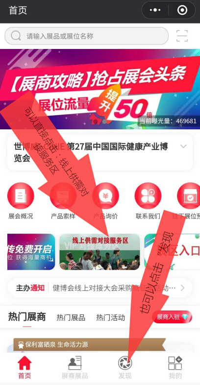 第二步:既可以点击“线上供需对接服务区”,也可以点击进入“发现页”翻到最下边的“供需对接”区