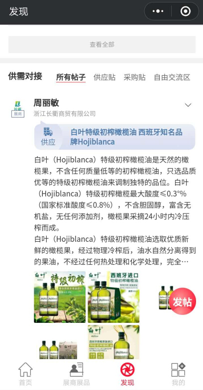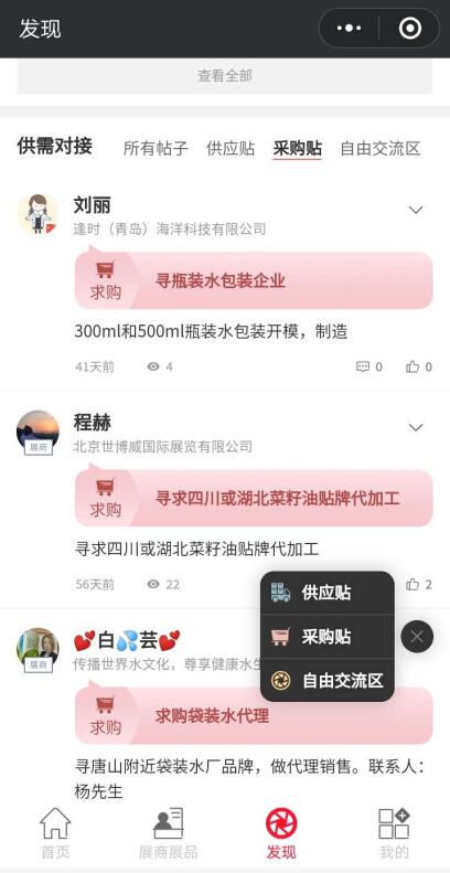 第三步:可以在线上“供需对接”中发布“供应贴”、“采购贴”、“自由交流贴”