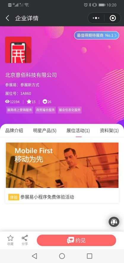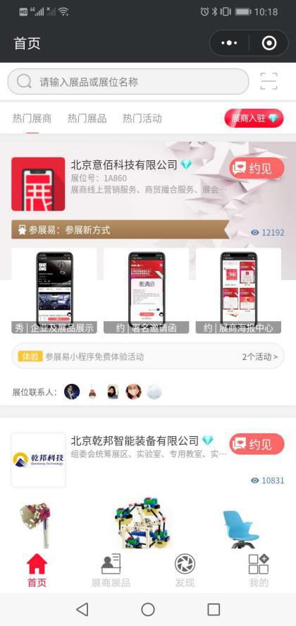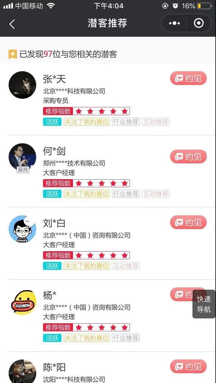 ·大数据分析,人工智能推荐潜客,开启获客新途径线上展商,可以收到系统大数据匹配的观众,查看潜客列表即刻进行约见。观众在线看展时,也会对感兴趣的展位发起约见。