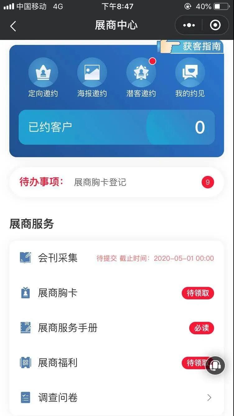 ·专业观众会在展前收集信息,制订自己的观展计划,所以展前是您约见客户的最佳时机。展商一定要在展前通过小程序向新老客户发送邀约、响应约见请求,合理安排现场接待人员及会谈时间,提高展会现场会谈效率,增加商机转化率。