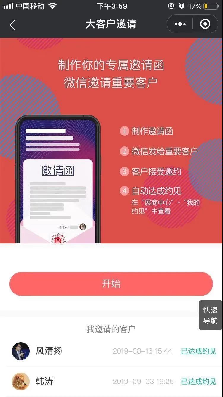 ·制作一对一专属邀请函,微信定向转发客户,带给用户贵宾级感受您可以通过展商中心的定向邀约功能,快速生成大客户专属邀请函;一键发送给您的核心客户,让参展邀请高大上。同时,您还可以实时查看邀请函接收状态,以便持续跟进!