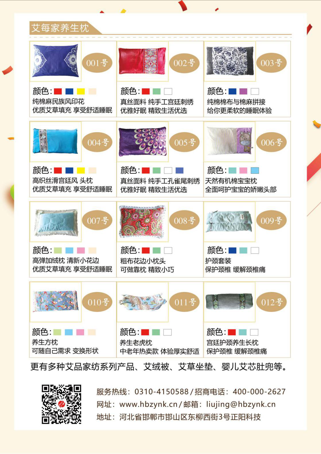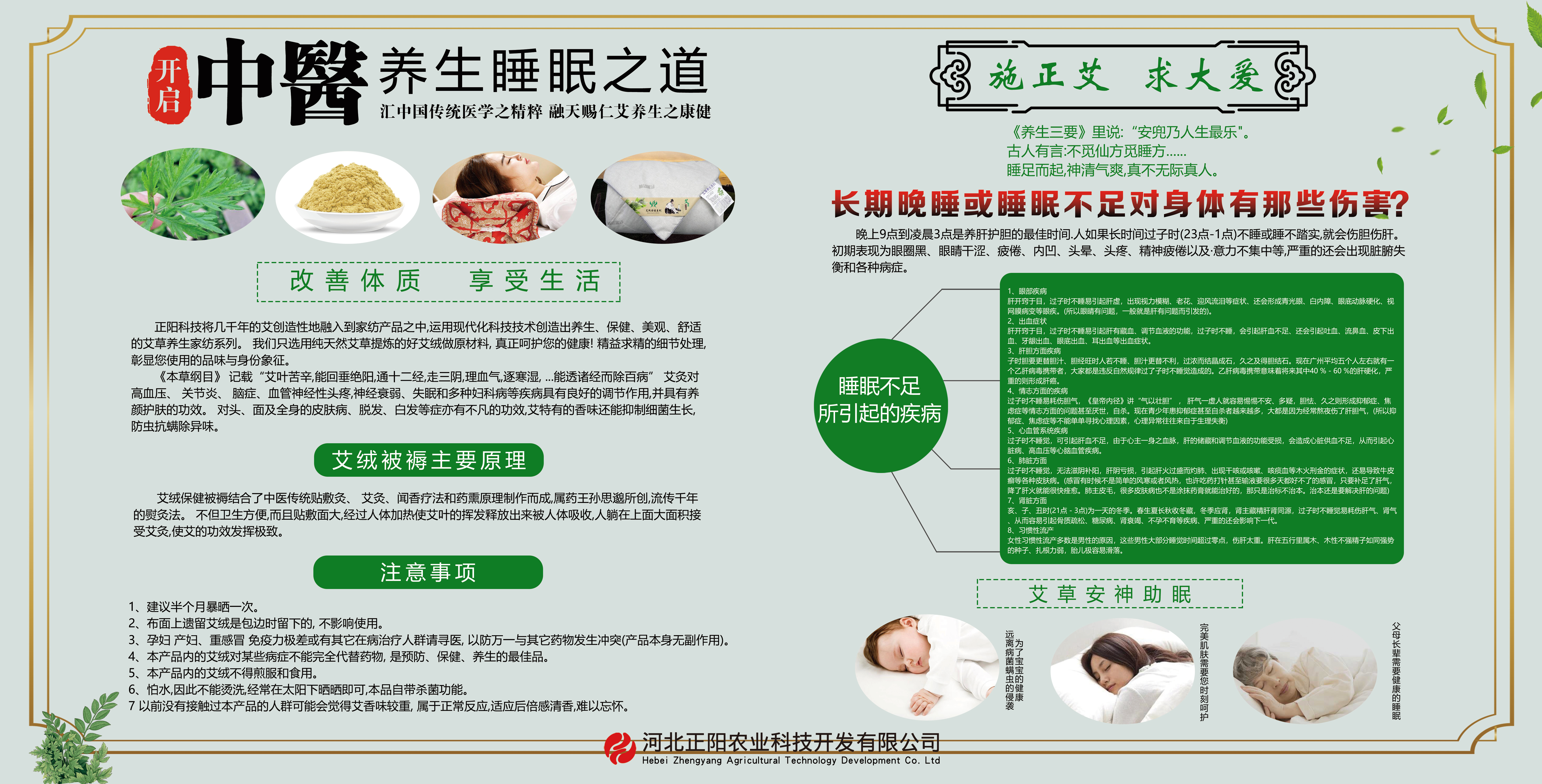 河北正阳农业科技开发有限公司为了弘扬中医文化,更为了本公司长远的发展,创立了艾灸的两个品牌:艾必徕,艾每家,受到了广大保健养生爱好者的欢迎。尤其是艾每家的养生枕和艾绒被褥帮助了很多有睡眠困扰的人。